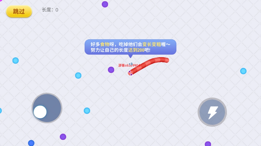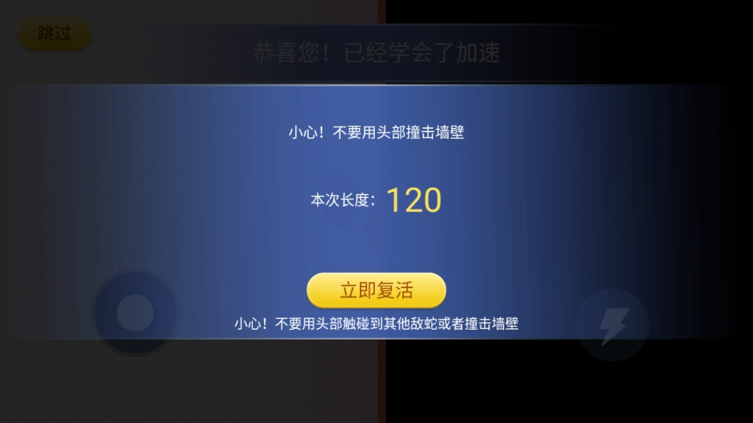 2、随后便会进入一段游戏教程,这能助力玩家更深入地熟悉游戏玩法。左边的按钮用于操控蛇移动的方向,右边的按钮则是负责加速。
