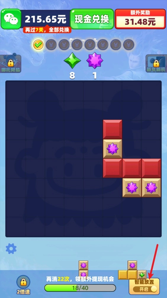 5、后续我们还能开启智能放置功能,躺着就能轻松过关。
