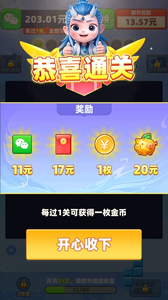 财虹贯日红包版,这款游戏极其考验玩家手速。玩家可借助方块合成消除的玩法,获取丰厚的红包奖励。游戏里各类道具均可使用,助力你轻松闯过一道道关卡。只要满足特定的关卡要求,就能完成任务,收获更为丰厚的奖励。尽情进行匹配消除,热衷于方块消除的玩家,千万别错过这款游戏!