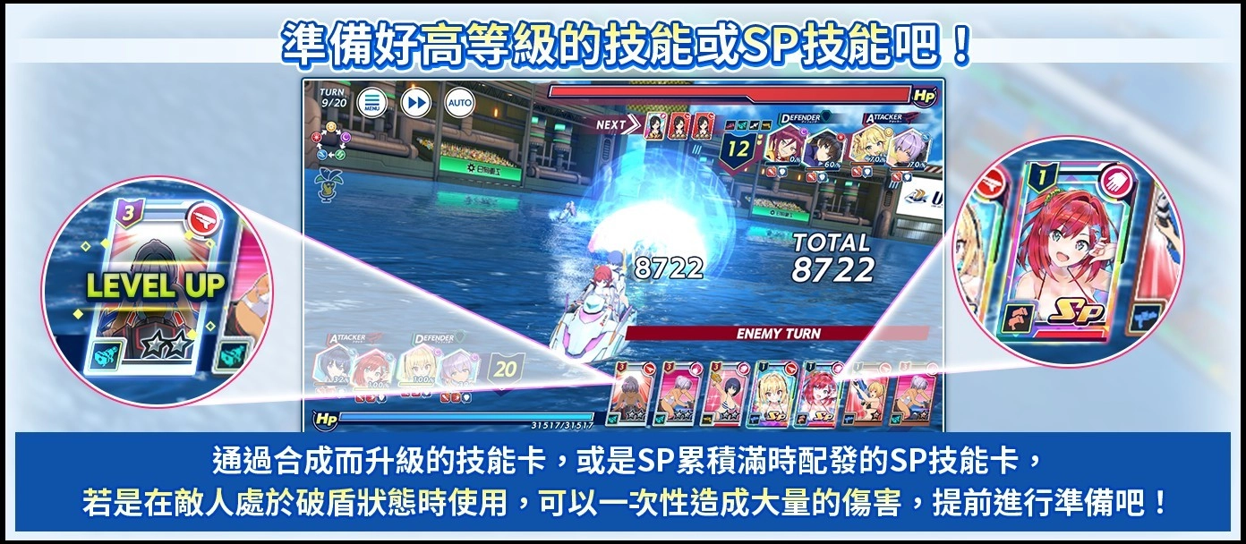 当敌人进入破盾状态,借助高阶技能与SP技能,给予敌人沉重打击!