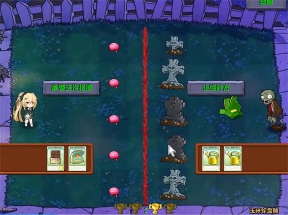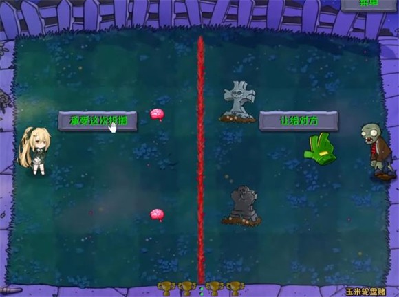 2、玉米娘扔完所有子弹后,便会开启下一轮。承受此次投掷,受益的是自己;让给对方,则是便宜了僵尸。赢得两次胜利,即可通关。