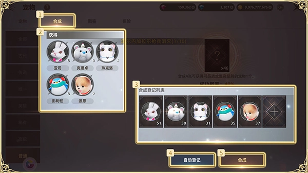1. 点击“合成”,即可展示当前能够作为合成材料的宠物及其数量。