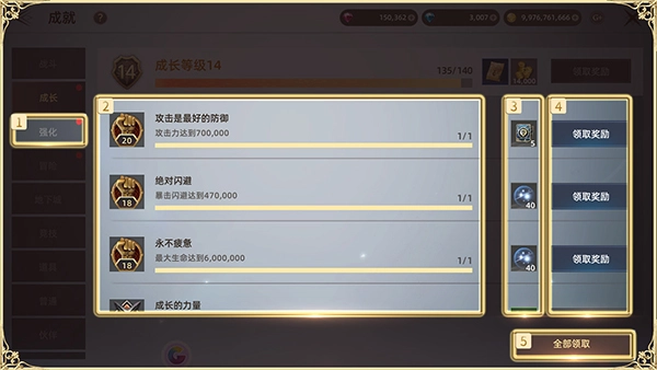 2、当达成成就目标后,领取奖励按钮便会激活,点击此按钮就能领取成就奖励。另外,也可点击右下角的全部领取按钮,实现一键领取奖励。