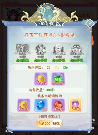 3、元宝扫荡:玩家所累积的经验与金币收益能够进行扫荡,每天可扫荡三次,若开通SVIP,还能增加扫荡次数哟~