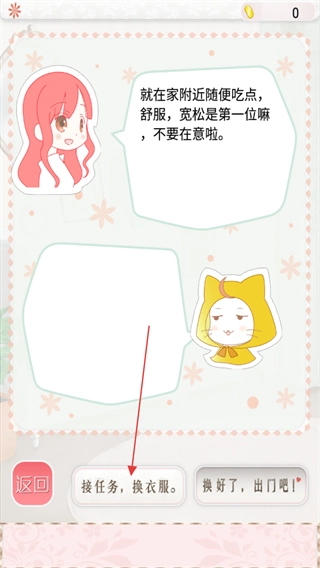 1. 阅读对话文本,当了解到在家附近就餐以及穿着要舒适宽松的建议后,点击“接任务”和“换衣服”按钮。