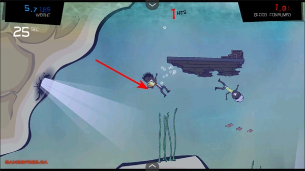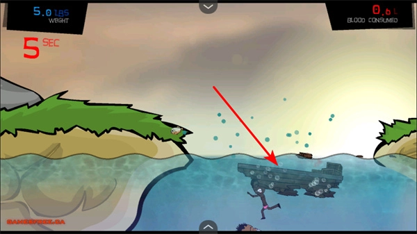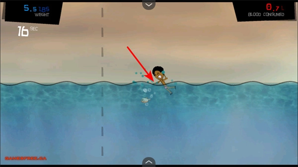 3、捕食小鱼,操控角色在水域中捕食人类,增加体重,还有机会获取血液资源,以用于升级。