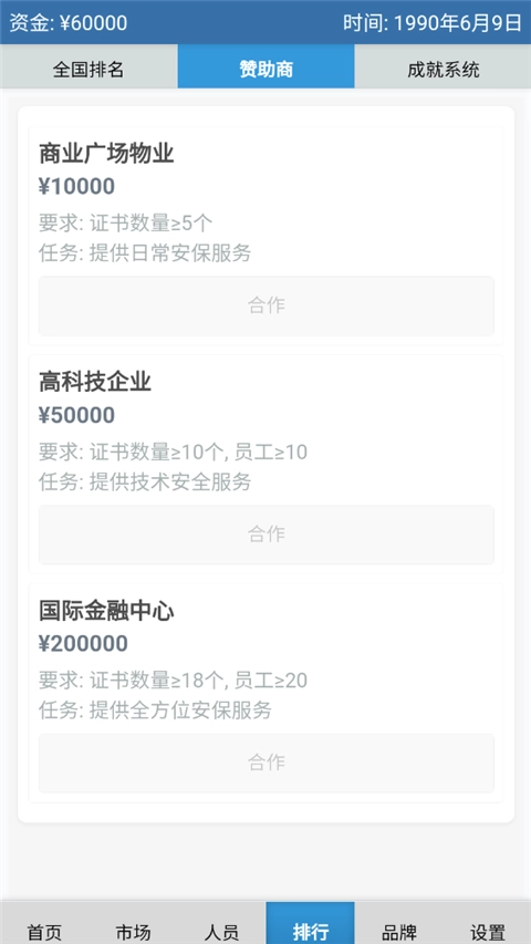 6、人事:人员招聘可在人员菜单的人才招聘页面进行。初期建议采用社会招聘方式(尽管员工等级不高,但能满足基本需求)。到了中期,可考虑使用猎头招聘(可通过观看广告或付费的形式,刷新出的员工等级相对较高)。而在后期,建议与人力资源签约(人员等级高,每次刷新能有15人,每月可刷新5次,但成本较大,除了初始的25万,每月还需扣除5万的服务费) 。