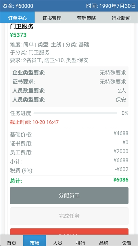 2、订单:进入市场菜单的订单中心页面接单。通常,接受任务按钮呈蓝色的任务,都是当下能够承接并完成的。接单后,点击“分配员工”,接着等待订单进度达到100%(进度不会实时更新,仅在切换页面时进度条才会更新)。订单进度到100%后,点击“完成订单”即可。需要注意的是,公司资金越多,扣除的税费越多,最高可达55%,初始为9%。要接取足够数量的订单。