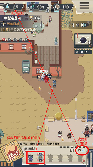 玩家能够挑选下方的僵尸来进行释放,只需点击地图上自己期望发起进攻的位置就能完成释放。释放僵尸需要消耗能量,能量会在左上角自动恢复,而右下角显示的则是释放僵尸所需的能量数值。