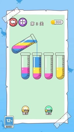 在水排序关卡中,液体颜色的区分是核心所在,需要依据颜色类别逐一将液体倒入试管,防止因混合而致使任务失败。