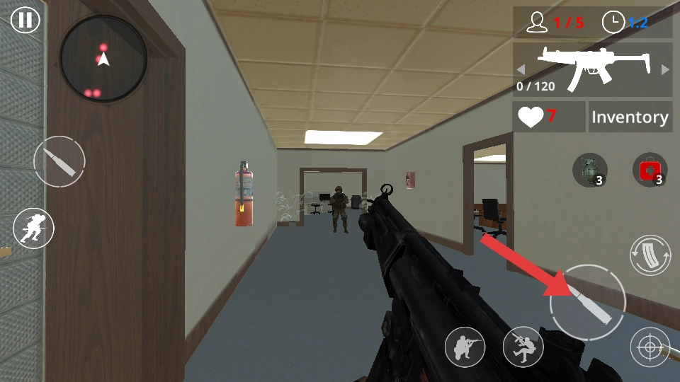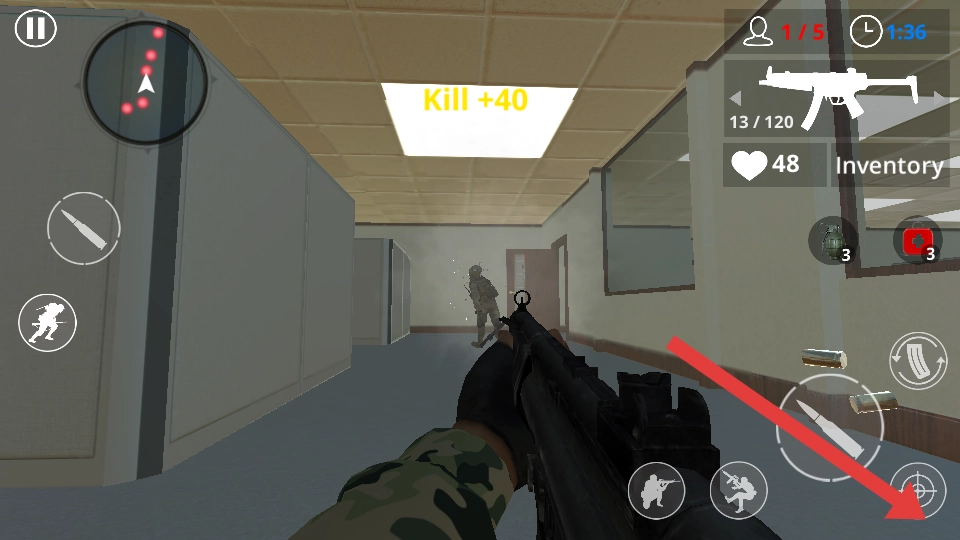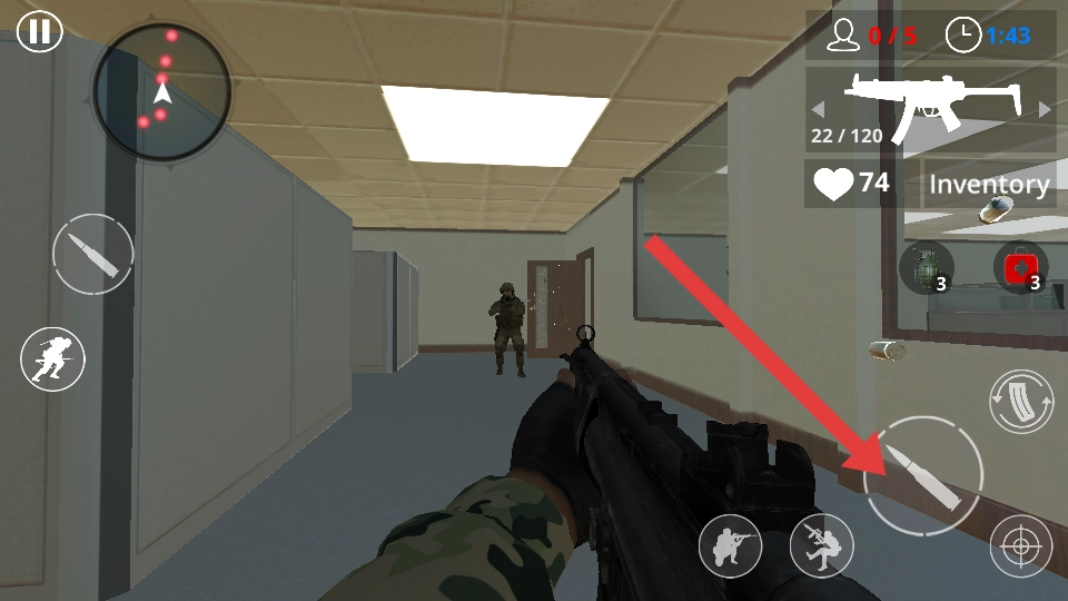 移动时借助办公桌、文件柜来掩护自己,缓缓探头搜寻敌人,一旦发现目标就优先瞄准射击;射击时要留意界面上的弹药剩余量。