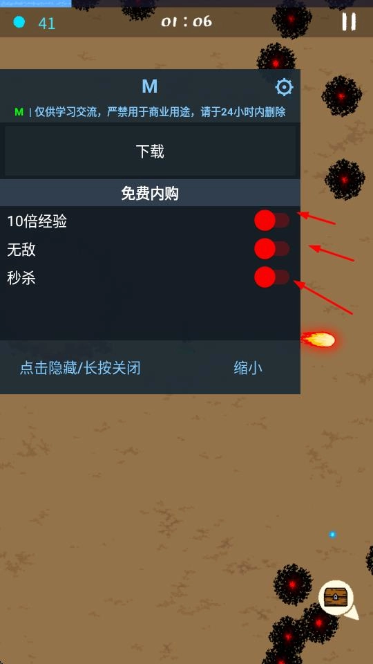 可以通过功能菜单启用10倍经验、无敌、秒杀等免费内购效果,让探索和战斗变得更轻松。