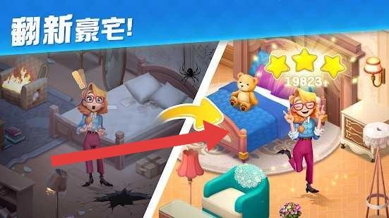 积累星星后,进入豪宅翻新环节,依据箭头指示,把破旧房间打造成星级卧室(19823分),从而提高家园的美观程度。