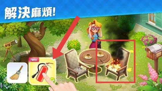 当庭院出现麻烦(比如椅子着火了),就点击箭头所指的灭火器道具,这样就能解决问题,让家园修复的进度往前推进,还能解锁新的区域。