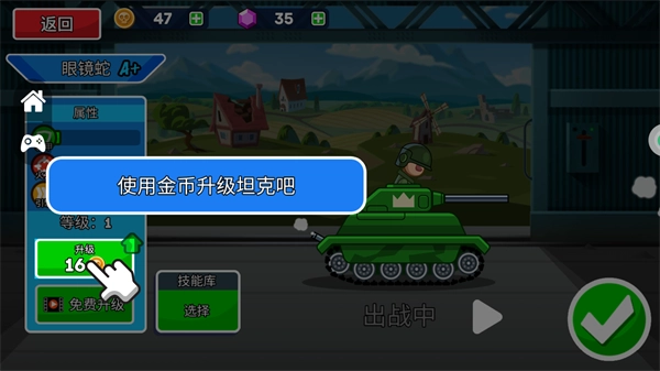玩家能用金币提升坦克等级,还能为坦克配备强力技能;钻石也可用于解锁技能,选好坦克后更能领取丰厚的游戏奖励。