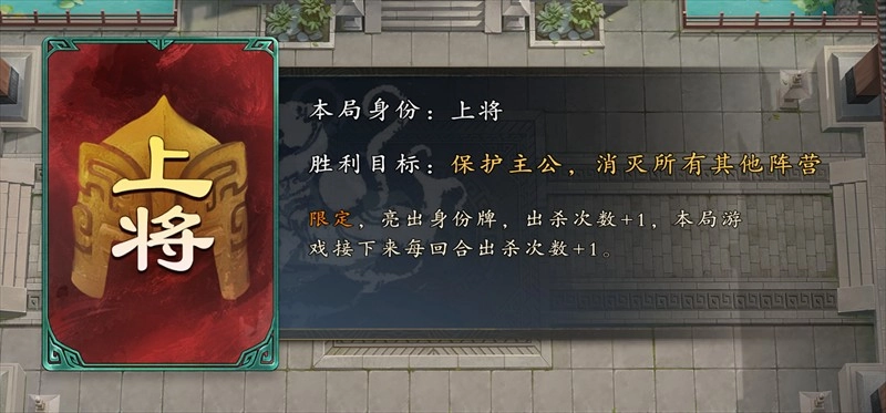 上将在游戏开局阶段会隐匿自身身份,场上存在3名主公,其中与自己颜色一致的才是真正的己方主公。当主动发动限定技能“奉旨平叛”(整局仅限使用1次)后,上将的身份便会揭晓,同时此后每回合能够额外打出1次杀。不过,身份公开后的上将全场可见,也因此更容易成为其他玩家集火攻击的目标。