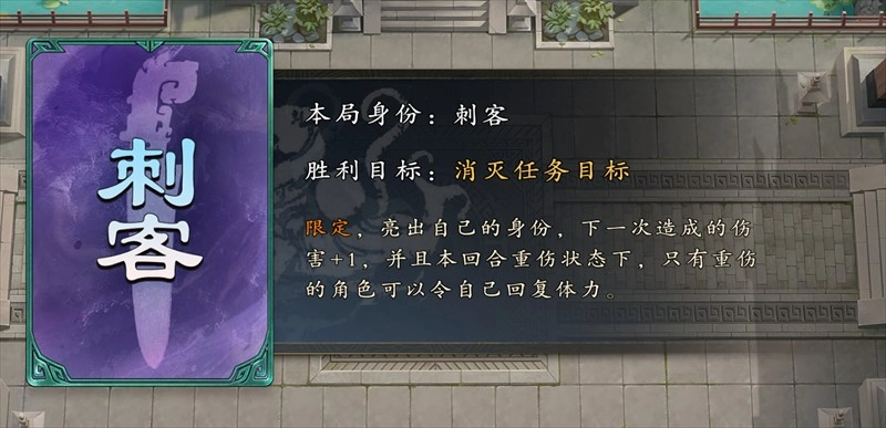 刺客:作为第三方身份,刺客只需消灭随机指定的任务目标即可获胜。由于刺客的存在,场上局势会更为复杂,因此开局不建议直接暴露身份,最好在任务目标体力值偏低时,再亮出身份进行补刀。