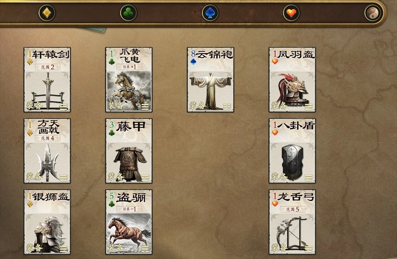 初始装备栏设有3个空位,可供放置武器、防具、马匹等类型的手牌,当栏位被填满后,若要新增装备则需进行替换操作。各类装备具备不同的效果加成,且装备牌的使用次数并无限制。初次接触游戏的新手可能会觉得手牌数量较多难以掌握,但只要通过一局局的实际游玩逐步积累经验,很快就能熟悉所有手牌的特性。
