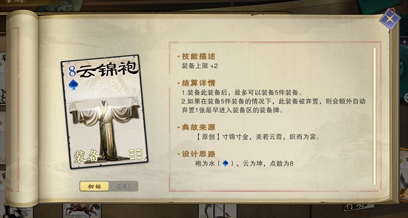 装备云锦袍后,装备上限会增加2个。若这件装备被弃置,系统会自动弃掉装备区里最早放入的牌(因此,当敌方拥有多件装备时,建议优先弃置他们的云锦袍)。