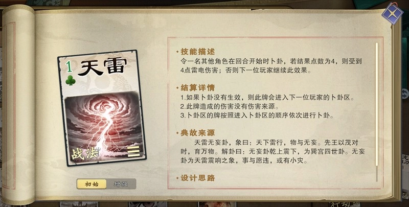 卜卦:部分战法牌在回合开始时会触发卜卦判定,参与判定的牌会按顺序进入卜卦区进行卜卦。比如天雷这张牌,会抽取一张牌,若抽到的牌点数为4,持有者就会受到4点伤害。
