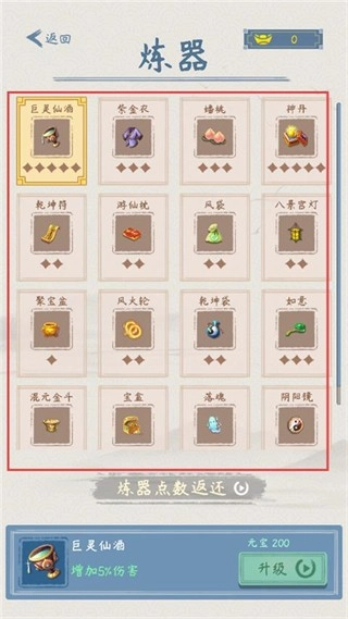 在炼器界面选择【巨灵仙酒】【紫金衣】等道具,通过消耗元宝进行升级,能够提升战斗属性,为修仙之路提供助力。