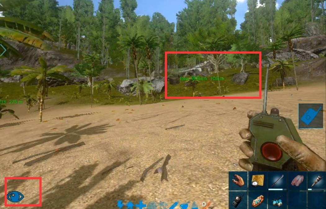 2、首先靠近生物,把追踪器和定位器都拿在手里,点击屏幕右侧将追踪器放到方舟生物的身体上。