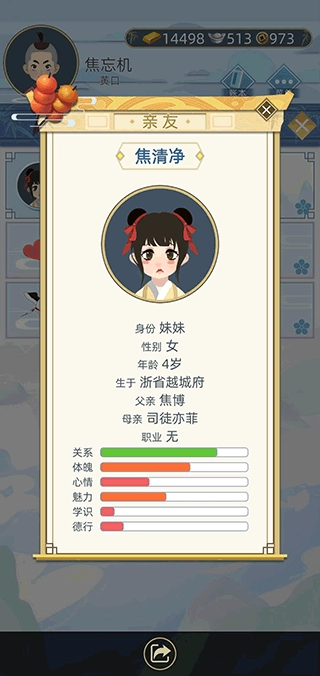 【16岁时解锁媒人功能】:介绍知己时可以看脸,但需要倒贴钱,起步价100两;而且通过这种方式结识的知己,其立誓环节只能沿用旧版本设定。不过等考上状元后,就能选择大学士或总督的女儿了,她们的魅力和学识属性会稍微高一些。