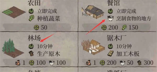 3、除了水井和画室需要多建造一些之外,餐馆和林场到了后期各建4个就足够了。林场负责生产木材,餐馆则是烹饪食物过程中不可或缺的设施。