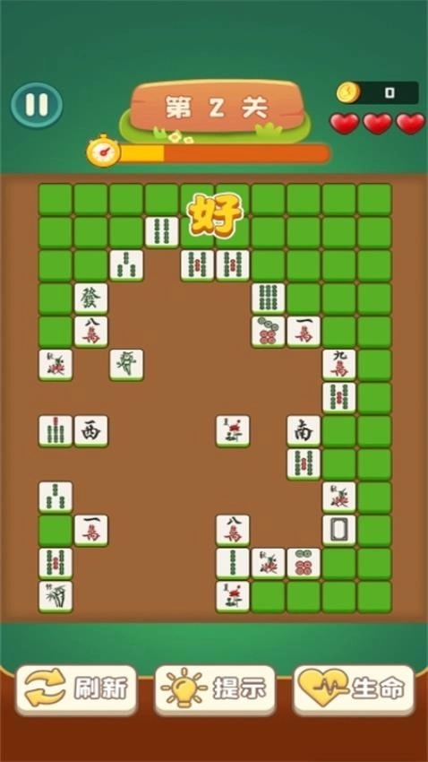 1、玩家需点击两张图案相同的麻将牌,当它们之间的连接路径转折次数不超过两次时,即可完成配对消除。
