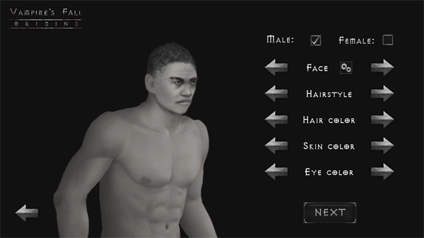 首次进入游戏时,需要为角色设定形象,可自定义角色的发型、肤色和瞳孔颜色等,设置完成后点击NEXT按钮进入后续环节。