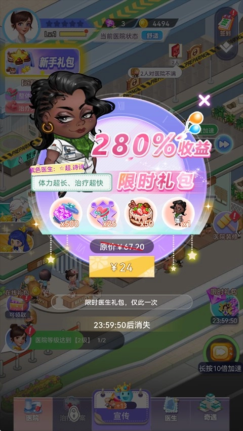 4、游戏里设计了不少具备特殊天赋的医生角色,只要招募这些医生,就能有效提高医院的治疗效率。