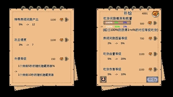 在每一大关开启前,可使用鸡腿强化全体英雄的基础属性,该加点为永久生效~建议优先将右上角的「吃货奖励概率与数量」点满,此属性能够显著增加每关卡结束后三选一英雄的数量及基础品质!