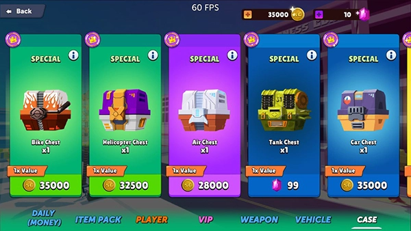 玩家点击左侧的Case,就能购买宝箱,可选择金币宝箱或钻石宝箱,其中包含武器、英雄皮肤等奖励。