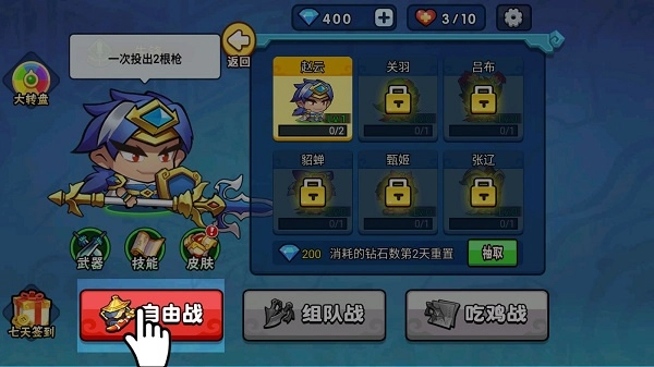 1、进入游戏后按照指引先从自由战模式练习,熟悉操作。