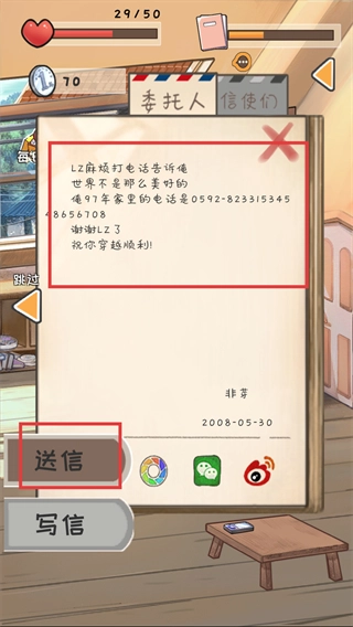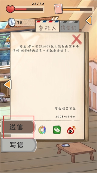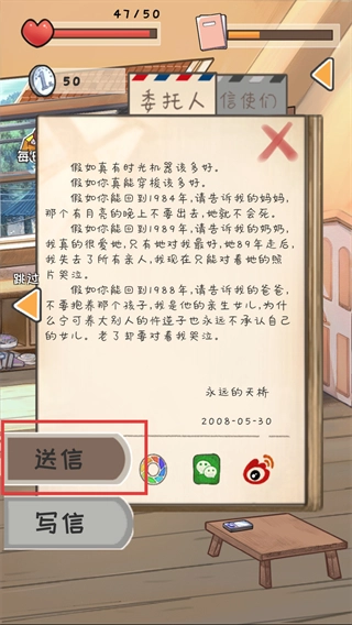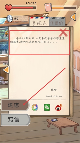 2、阅读【热邪】的信件,知晓其想让97年的自己吃爷爷炸的油条,点击【送信】按钮处理此委托。
