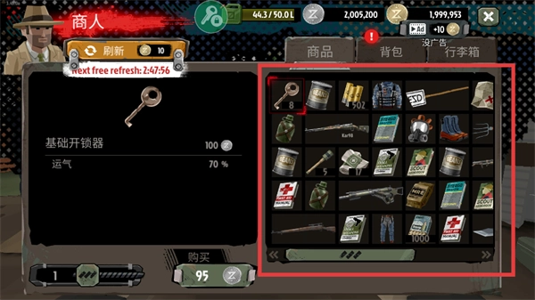 2、利用购买红框内的【钥匙】【武器】【弹药】【防具】等各类资源,提升装备和生存能力。