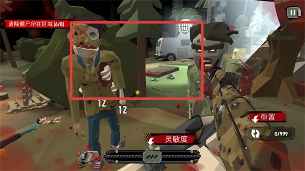 1、清理僵尸至进度“6/8”后,继续攻击剩余僵尸(红框内),每击会显示伤害数值,直至完成初始清理目标。
