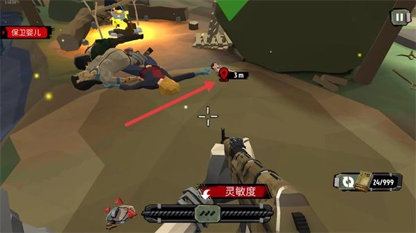 3、留意界面上显示的“3m”距离提示,瞄准那些靠近婴儿的僵尸,迅速开火进行拦截,以防僵尸逼近目标。