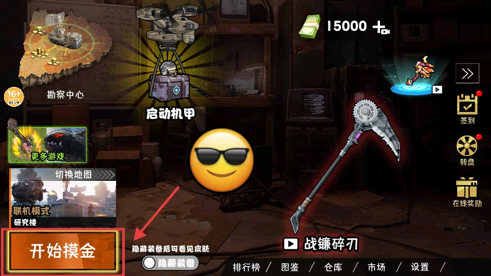 点击【开始摸金】即可开启游戏冒险之旅,你可以勾选隐藏装备选项来查看皮肤,为接下来的探索提前做好准备。