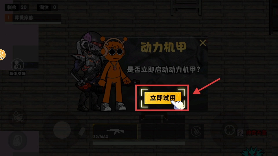 当启动动力机甲的提示出现时,点击【立即试用】按钮,即可获取机甲以增强战斗能力。