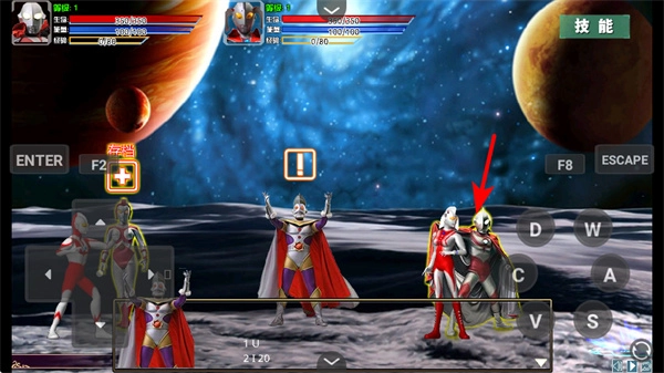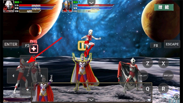在奥特曼战斗游戏里,你需要操控左边的奥特曼角色,借助虚拟按键来改变移动方向,在星际战场上巧妙地移动,寻找合适的站位。