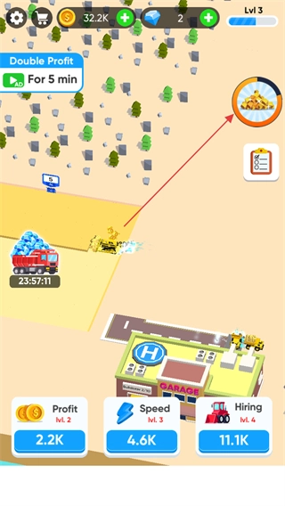 点击下方的Hiring按钮,使用金币雇佣更多推土机,以此来提高挖掘效率。