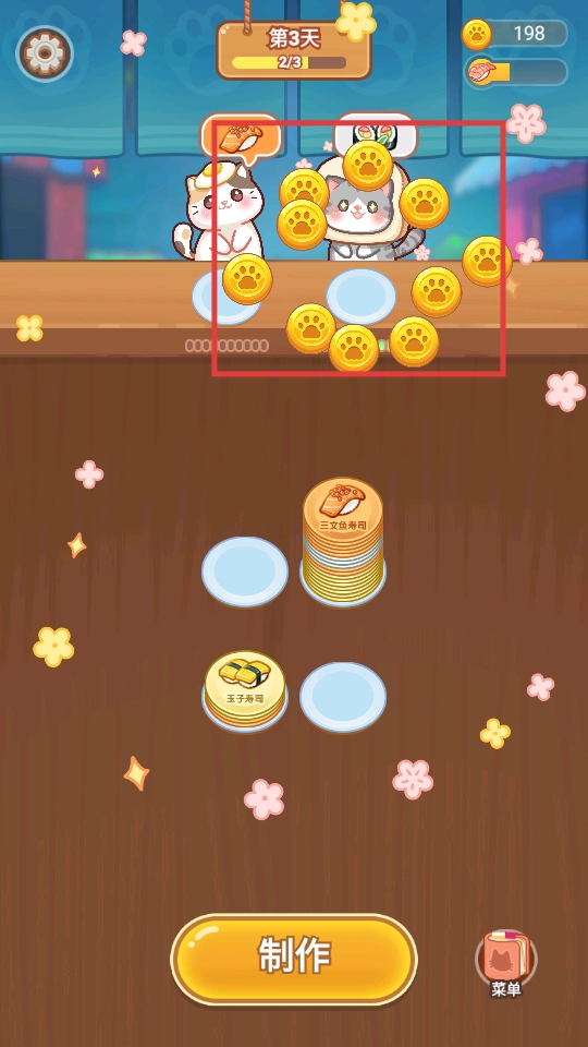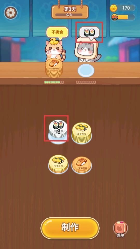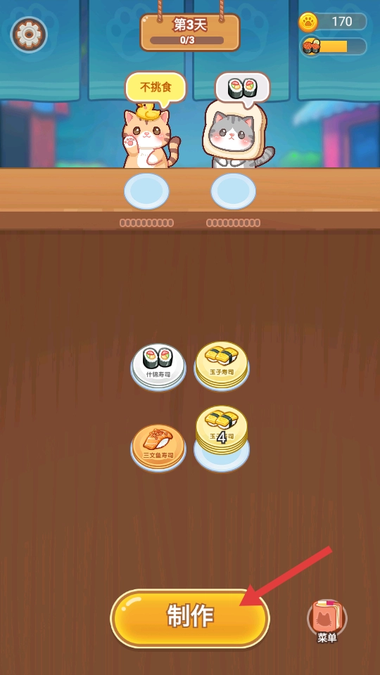 点击【制作】按钮,为猫咪顾客制作寿司,满足它们的口味需求,推动店铺营业的进程。