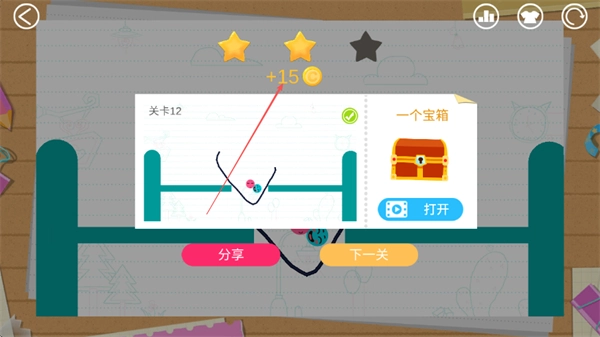 通关后会得到星星评价与金币奖励,比如+15这样的数值,点击下一关就能继续挑战,另外也能打开宝箱来获取奖励。