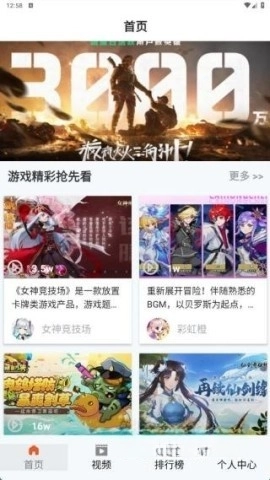 安装完成后,进入首页,你能看到精彩抢先看的游戏视频,这里各类主题应有尽有,让人目不暇接。