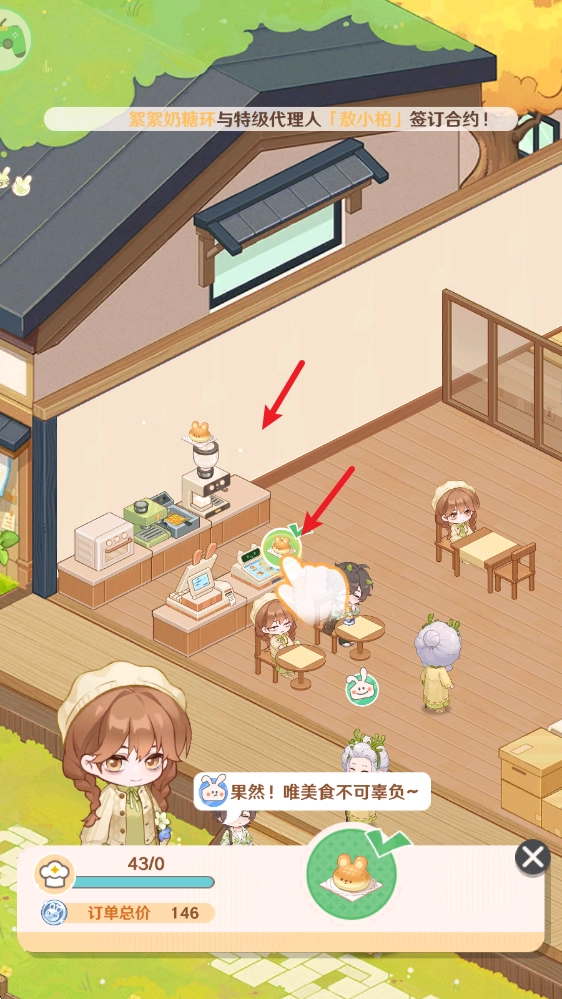 之后我们挑选对应的设施来制作餐品,制作完成后点击客人就能送餐了。