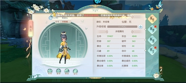 在角色面板里,你能查看角色的各项属性,也可以借助境界突破、脉络修炼和转生系统来提升自身实力。