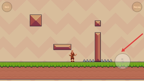 游戏场景遇尖刺障碍,点击右侧圆形按键,操控武僧跳跃,避开危险地形,持续推进关卡进度。