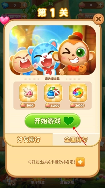 2、挑选关卡,点击“开始游戏”按钮,每启动一次游戏都会消耗一颗爱心。