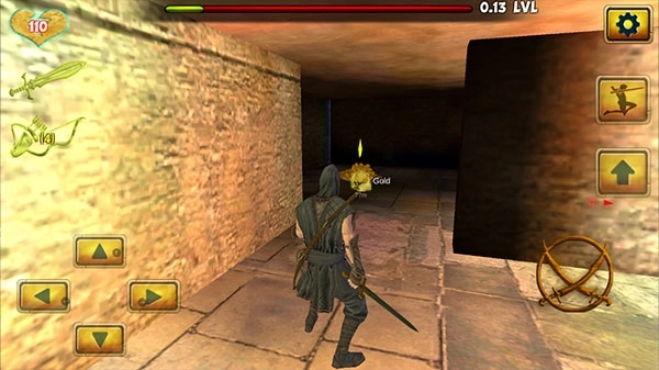 2、左下角按钮控制武士自由移动,右侧屏幕滑动可以旋转视角,调整方向,左侧分别是生命值初始100、刀、以及弓箭,箭需要在场地内自由拾取,初始为0。